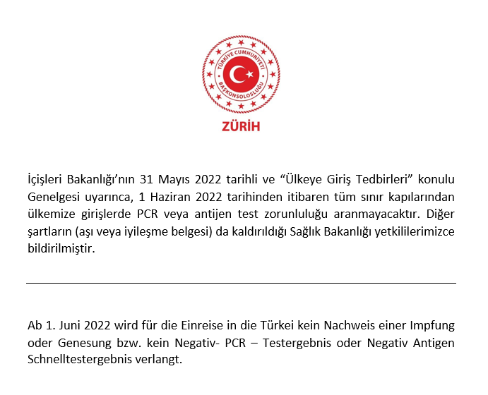 İçişleri Bakanlığı’nın 31 Mayıs 2022 tarihli ve “Ülkeye Giriş Tedbirleri” konulu Genelgesi uyarınca, 1 Haziran 2022 tarihinden itibaren tüm sınır kapılarından ülkemize girişlerde PCR veya antijen test zorunluluğu aranmayacaktır. Diğer şartların (aşı veya iyileşme belgesi) da kaldırıldığı Sağlık Bakanlığı yetkililerimizce bildirilmiştir.